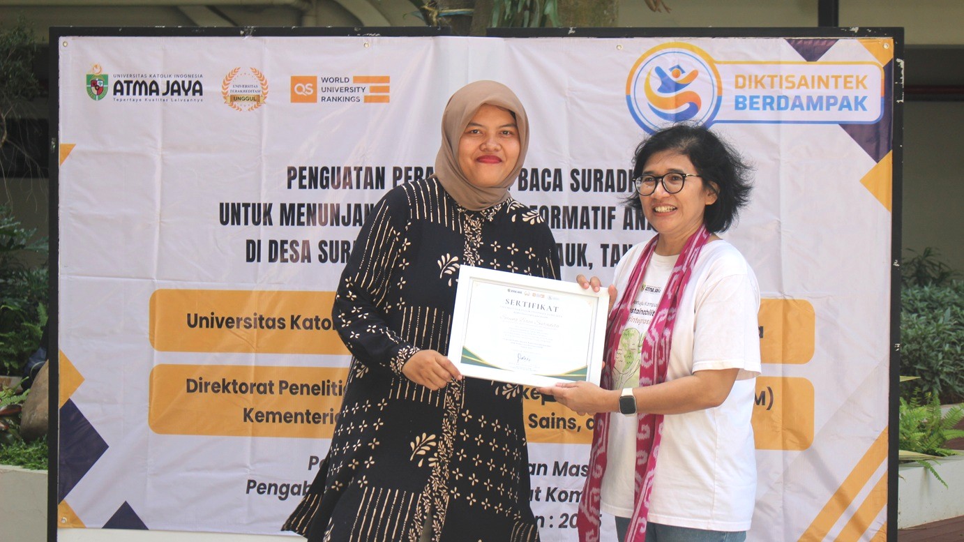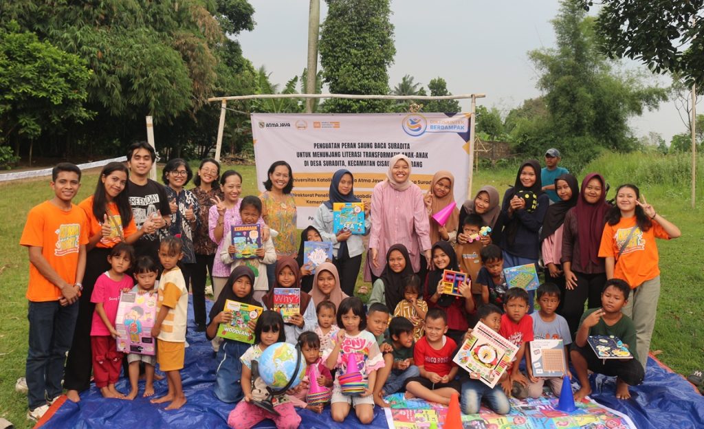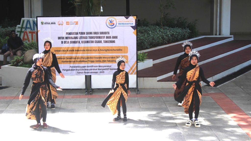 Selama tiga bulan, Tim PKM UNIKA Atma Jaya melaksanakan serangkaian kegiatan pemberdayaan di Saung Baca Suradita, Kabupaten Tangerang. Program tersebut mencakup pelatihan bagi para pendamping Saung Baca, pemberian sarana belajar seperti buku dan alat edukatif, serta pelatihan kesenian untuk anak-anak.
